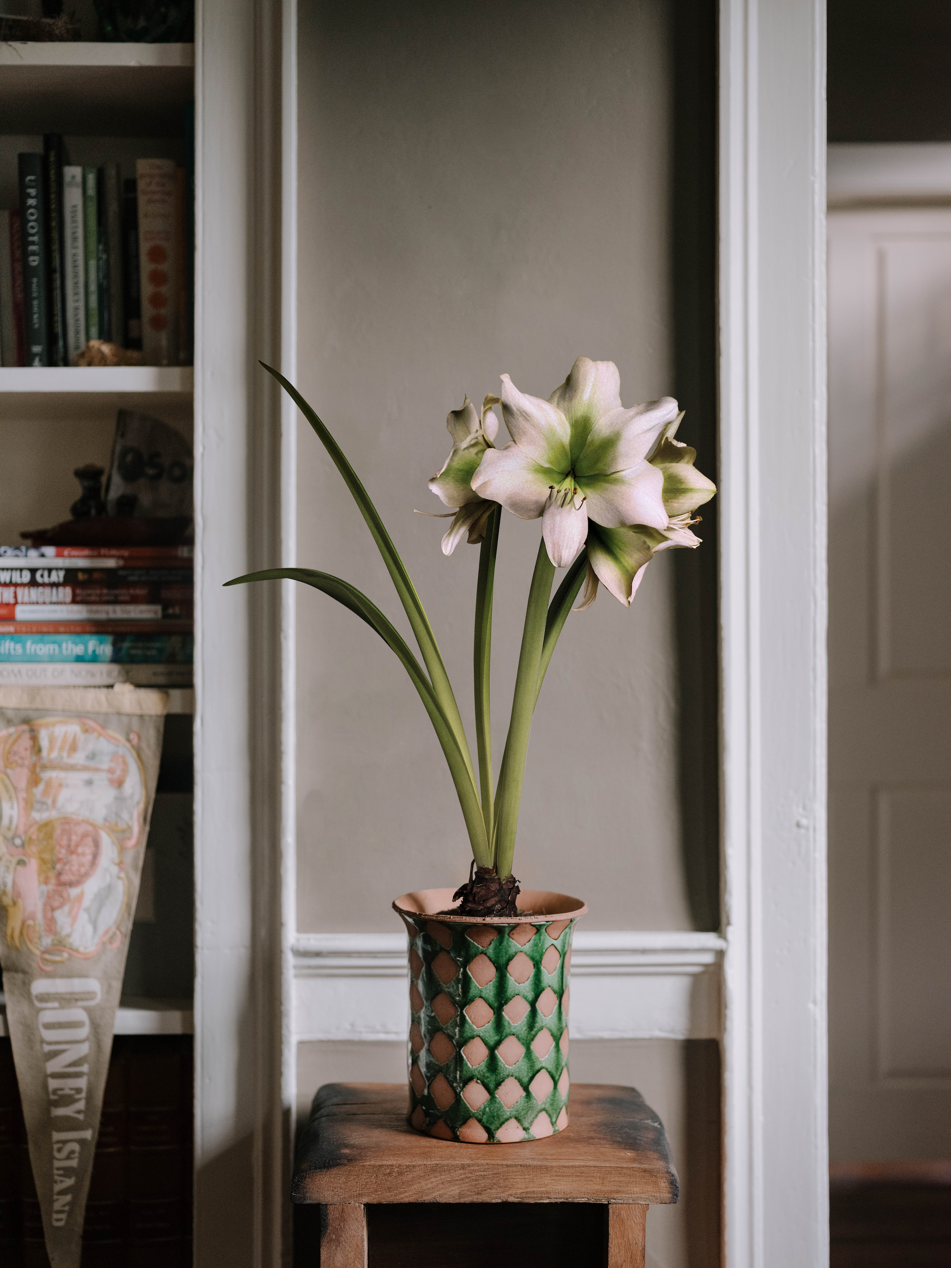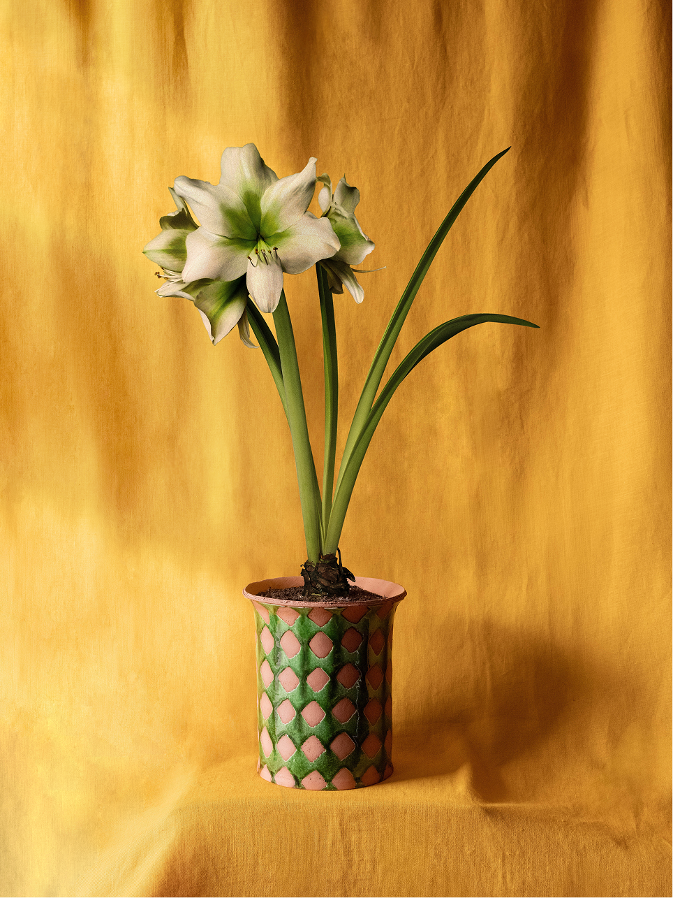 Handmade in our riverside studio, this glazed terracotta planter features a distinctive, hand-painted diamond pattern finished in a copper-green glaze that catches the light in shifting tones. Planted with a single amaryllis bulb, it will unfurl into large, creamy white blooms with a chartreuse throat four to six weeks after arrival. Each planter carries the warmth of the hand that shaped it, the glaze pooling in subtle variations that make every piece unique—a classic wintertime gesture, reimagined.